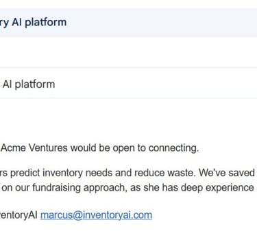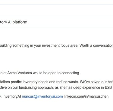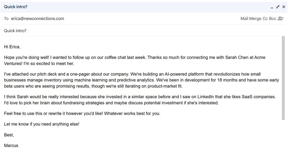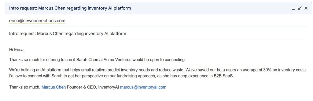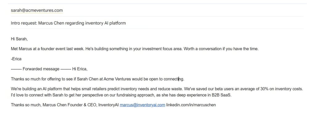"Hi Sarah, met Marcus at TechCrunch last week. Sharp founder, interesting approach to retail inventory. Worth 15 minutes if you have bandwidth."