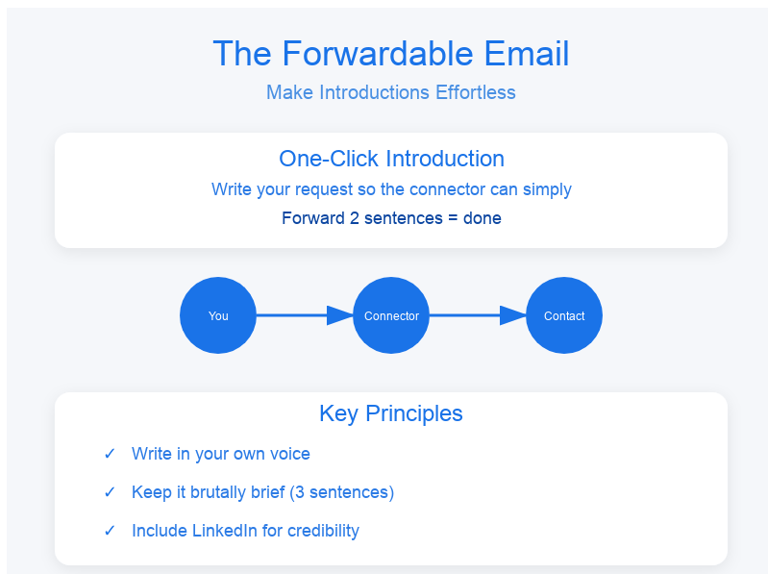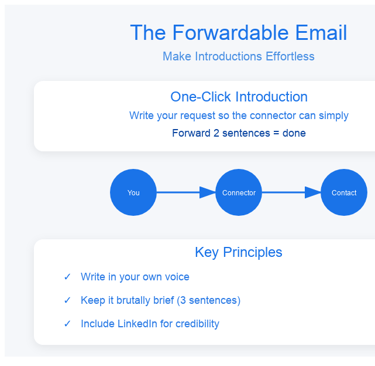 A forwardable email is an introduction request written so efficiently that your connector can simply hit "forward," add their contact's email address, write a two-sentence note at the top, and send it off in under 30 seconds.