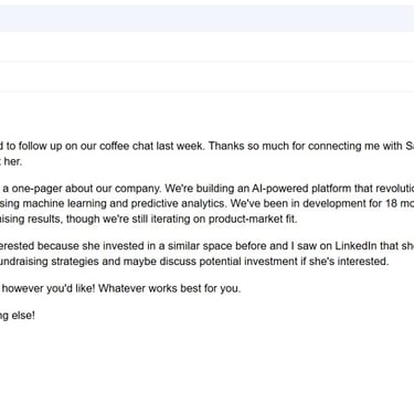 Marcus, a startup founder, meets Erica, an angel investor, for coffee. During their conversation, Marcus mentions he's actively fundraising and looking to connect with investors who specialize in B2B SaaS platforms. Erica knows Sarah Chen, a venture capitalist at Acme Ventures who focuses specifically on platform investments. Erica offers to see if Sarah would be open to a conversation with Marcus.