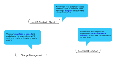 We provide operations consulting and business process automation for profitable B2B companies generating at least $1M in revenue. Instead of hiring additional headcount, we optimize your existing workflows through AI-powered automation and strategic process design—typically at 1/3 the cost of a full-time hire.