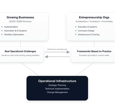 All that hands-on experience becomes the foundation for the curriculum we design for accelerators, incubators, and universities. When we teach entrepreneurship organizations how to prepare founders to scale, we're teaching frameworks that have been battle-tested with real businesses facing real constraints.