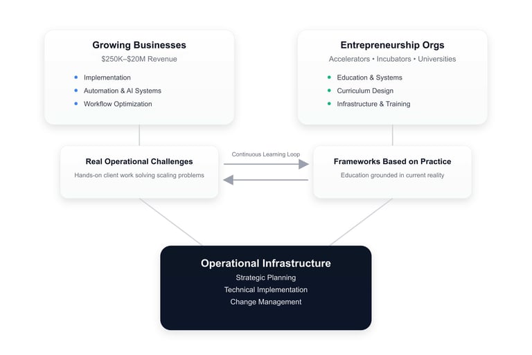 But together? Our consulting work forces us to systemize our thinking (because we're preparing to teach it), and our education work keeps us focused on what founders actually need (because we're constantly testing our frameworks with real businesses).